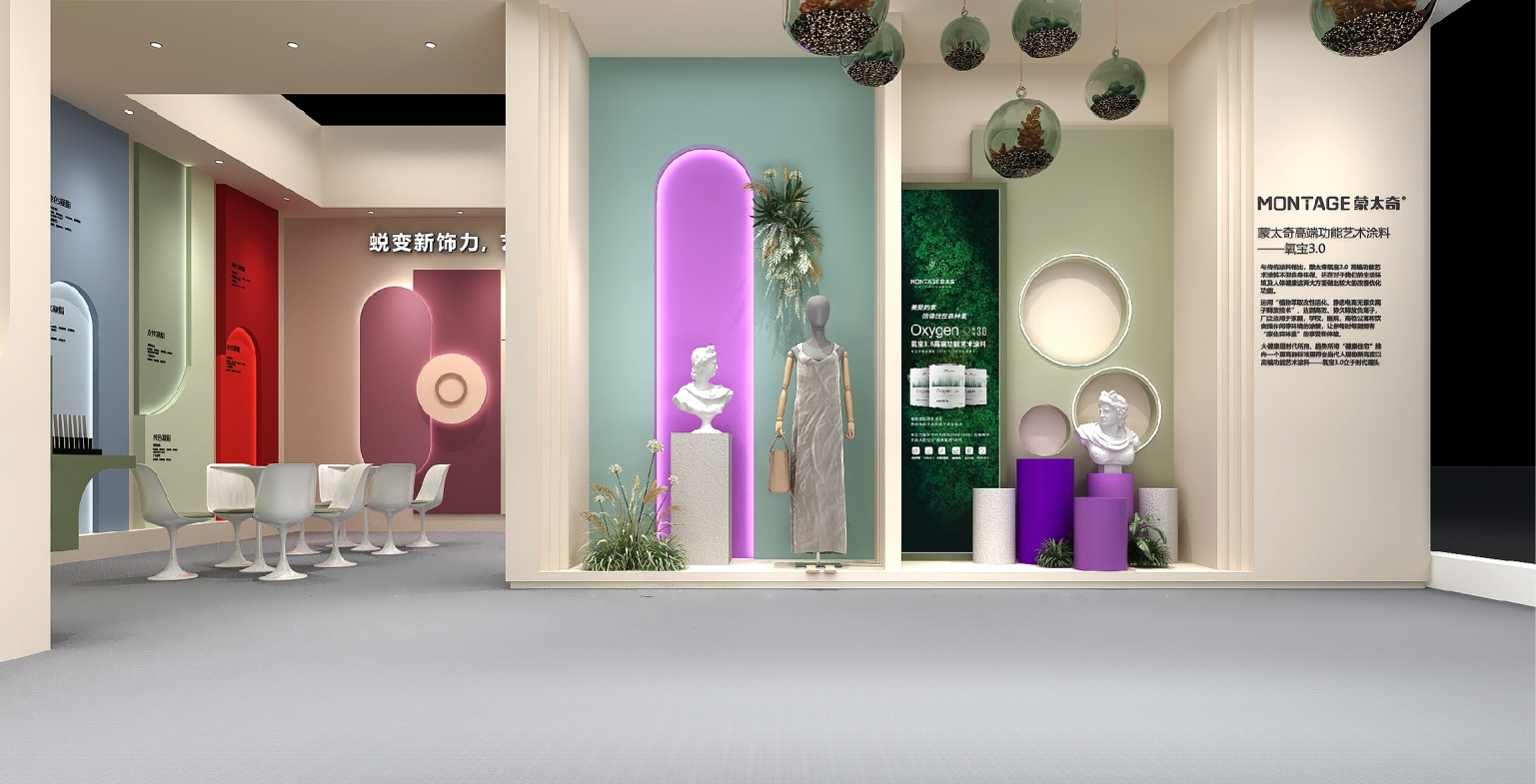 當(dāng)“藝術(shù)蒙太奇”“藝術(shù)=蒙太奇”符咒營(yíng)銷(xiāo)的序幕一旦拉開(kāi),撲面而來(lái)的只有傳承與創(chuàng)新。2024年廣州建博會(huì),蒙太奇展館雖然仍舊以“一起森呼吸·藝術(shù)蒙太奇”為主題,仍然以“氧寶3.0系列高端負(fù)氧離子功能藝術(shù)涂料”為主打,但蛻變的力量給了我們更多的驚艷:以蒙太奇品牌獨(dú)特元素的“M”作為基本造型,以象征創(chuàng)新生命力的“破繭成蝶”為框架,輔以象征吉祥美好的“東來(lái)紫氣”為聚焦色,在110㎡的場(chǎng)地里營(yíng)造了一個(gè)負(fù)氧離子功能藝術(shù)涂料溫潤(rùn)下的持續(xù)生長(zhǎng)的美好空間。