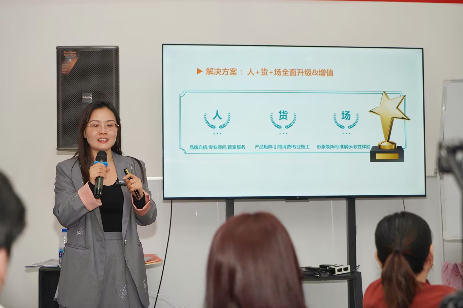 跨年大促活動中,粵閩瓊將三地聯動年末狂歡,共同探索終端門店O2O新營銷模式。因此,在特訓營課程第二天,蒙太奇品牌聯合創始人、藝術涂料最美老板娘呂芳方,聚焦“消費降級與行業內卷下門店強勢動銷的策略”,從人、貨、場三個維度,融合線上線下成交邏輯,為現場的經銷商家人們進行了專題培訓,指導經銷商如何有效拓寬獲客渠道、提升轉化效率。