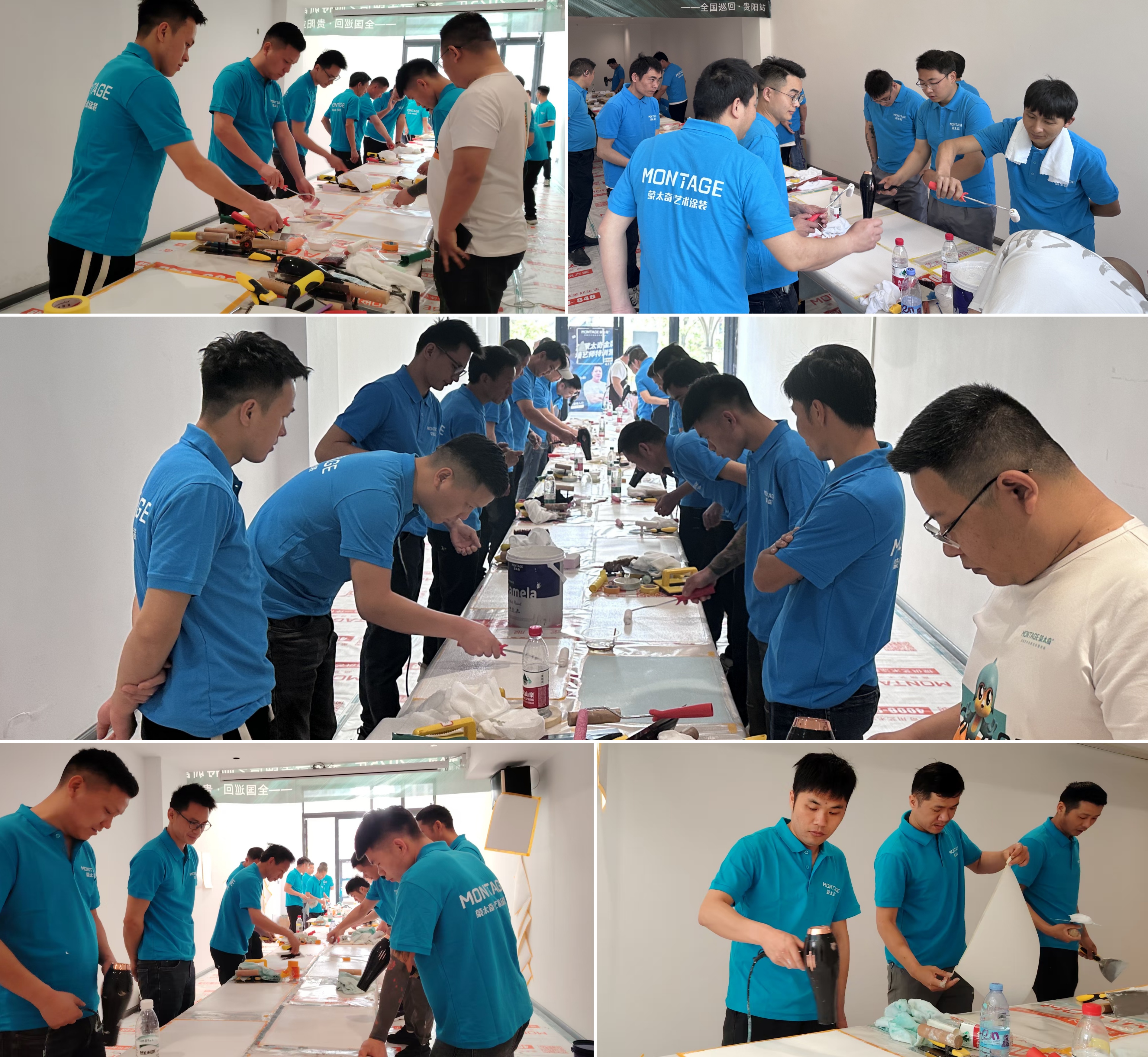 蒙太奇商學(xué)院技術(shù)應(yīng)用總工張純文,圍繞“施工黑科技+潮流工藝拆解”兩大核心模塊,開展一場(chǎng)關(guān)于產(chǎn)品特訓(xùn)、色彩應(yīng)用實(shí)操、表面質(zhì)地技巧和工具設(shè)備運(yùn)營(yíng)的實(shí)操工藝培訓(xùn),同時(shí)還針對(duì)技術(shù)標(biāo)準(zhǔn)+施工流程+特殊工藝應(yīng)用等關(guān)鍵環(huán)節(jié)進(jìn)行詳盡的講解。通過(guò)全方位、專業(yè)化的培訓(xùn),助力蒙太奇西南區(qū)域墻藝師精進(jìn)藝術(shù)涂裝技術(shù)。