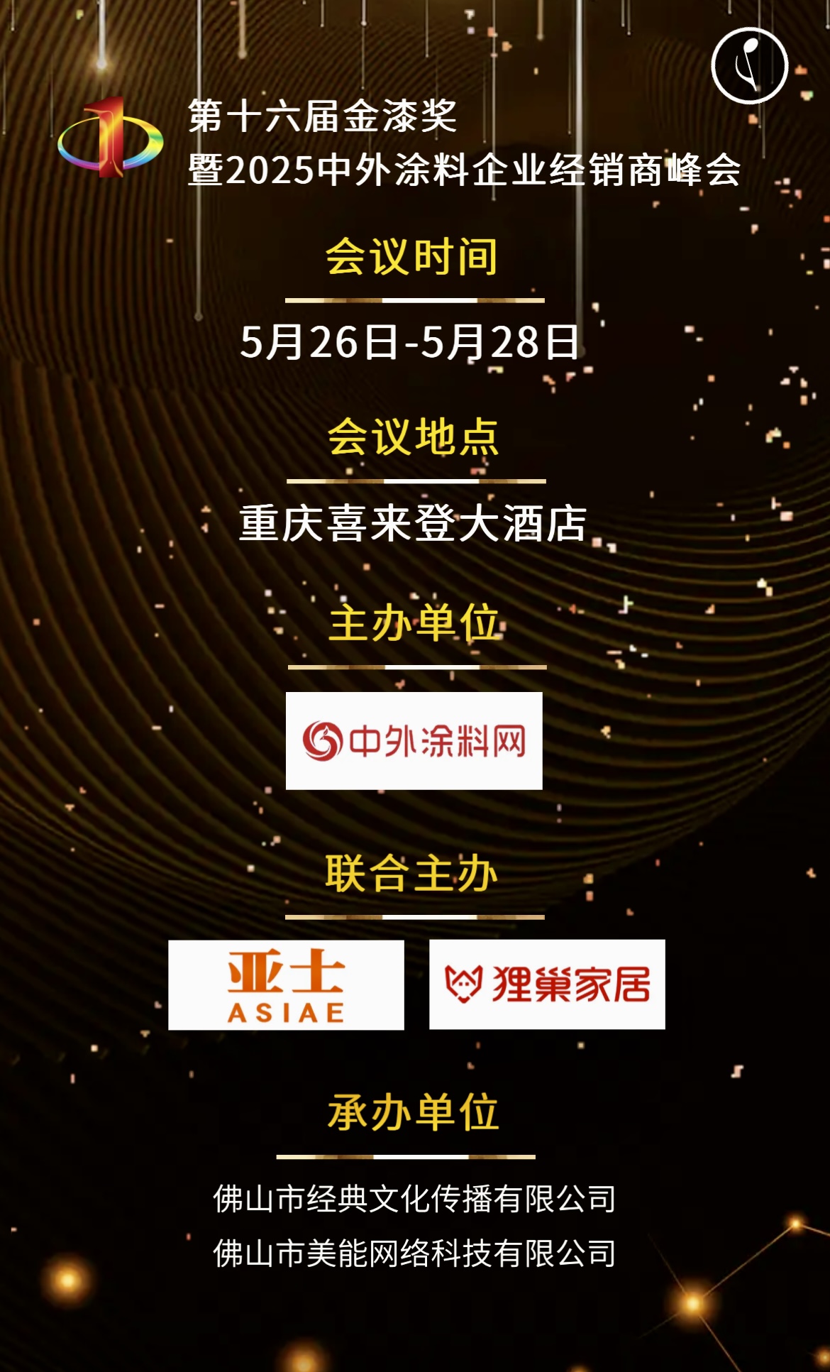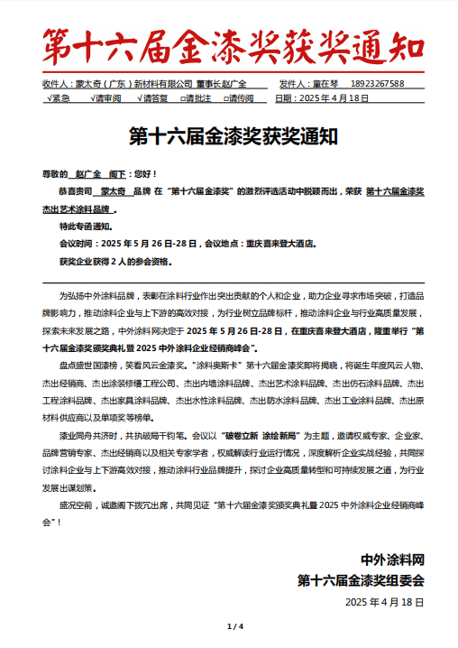 第十六屆金漆獎頒獎典禮暨2025中外涂料企業經銷商峰會于2025年5月26日—28日,在重慶喜來登大酒店盛大啟幕。蒙太奇受邀出席,將與行業同仁共探發展新機遇。此次榮膺金漆獎,對于蒙太奇而言既是行業權威的至高認可,也是品牌承諾責任的新起點。誠邀全國經銷商伙伴、消費者關注頒獎盛會,共同見證品牌榮耀時刻。