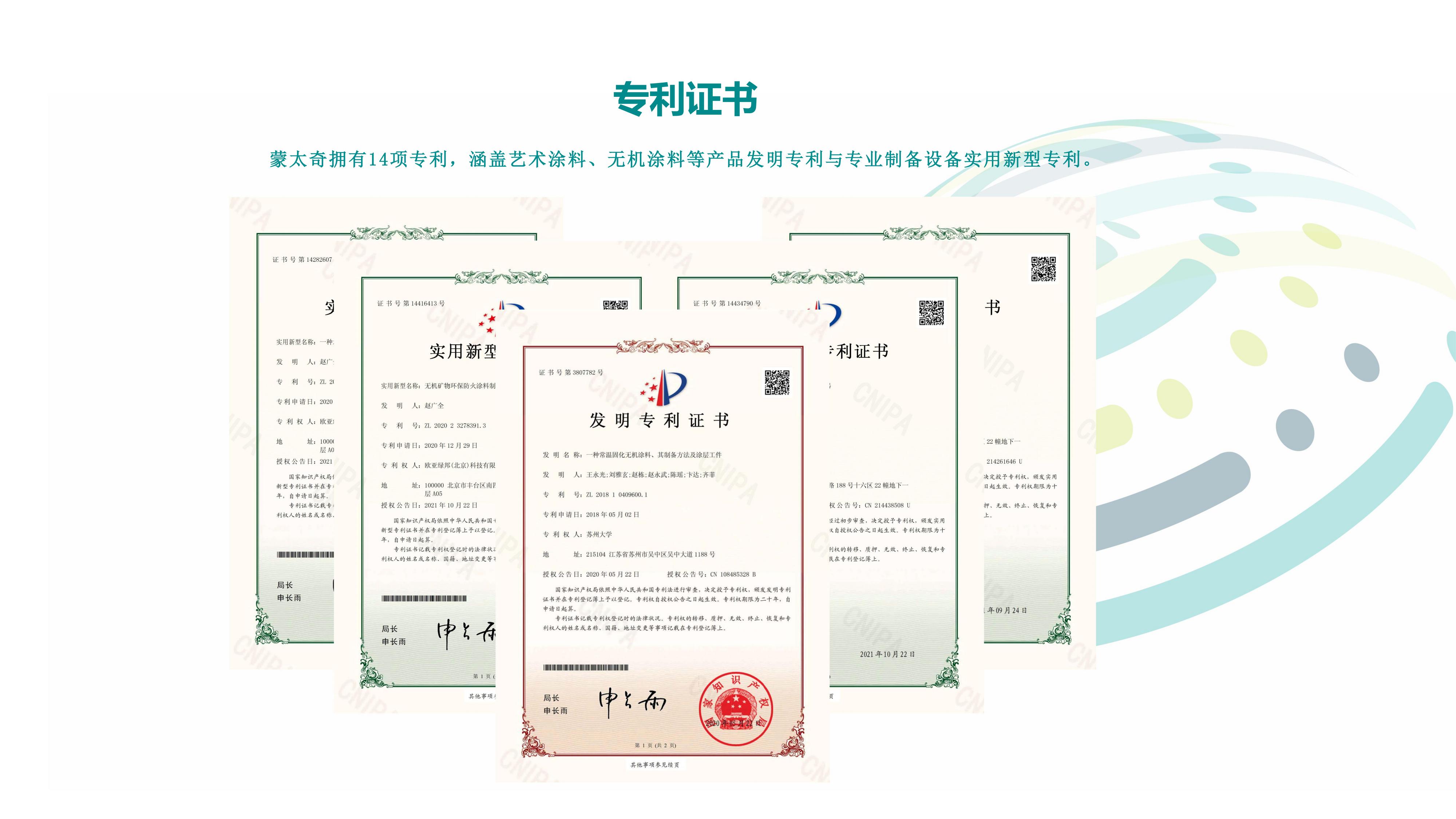 在此專利獲準前,蒙太奇已擁有14項專利,涵蓋藝術涂料、無機涂料等產品發明專利與專業制備設備實用新型專利。在嚴格遵循國家標準、通過基礎認證的基礎上,蒙太奇主動對標國際先進水平,成為行業首批獲得《水性內墻涂料中有害物質限量認證》及3C強制產品認證的雙資質品牌。這些技術成果與權威認證的積累,不僅印證了蒙太奇的研發實力,更為藝術涂料行業的標準化建設添磚加瓦,推動行業邁向新高度。