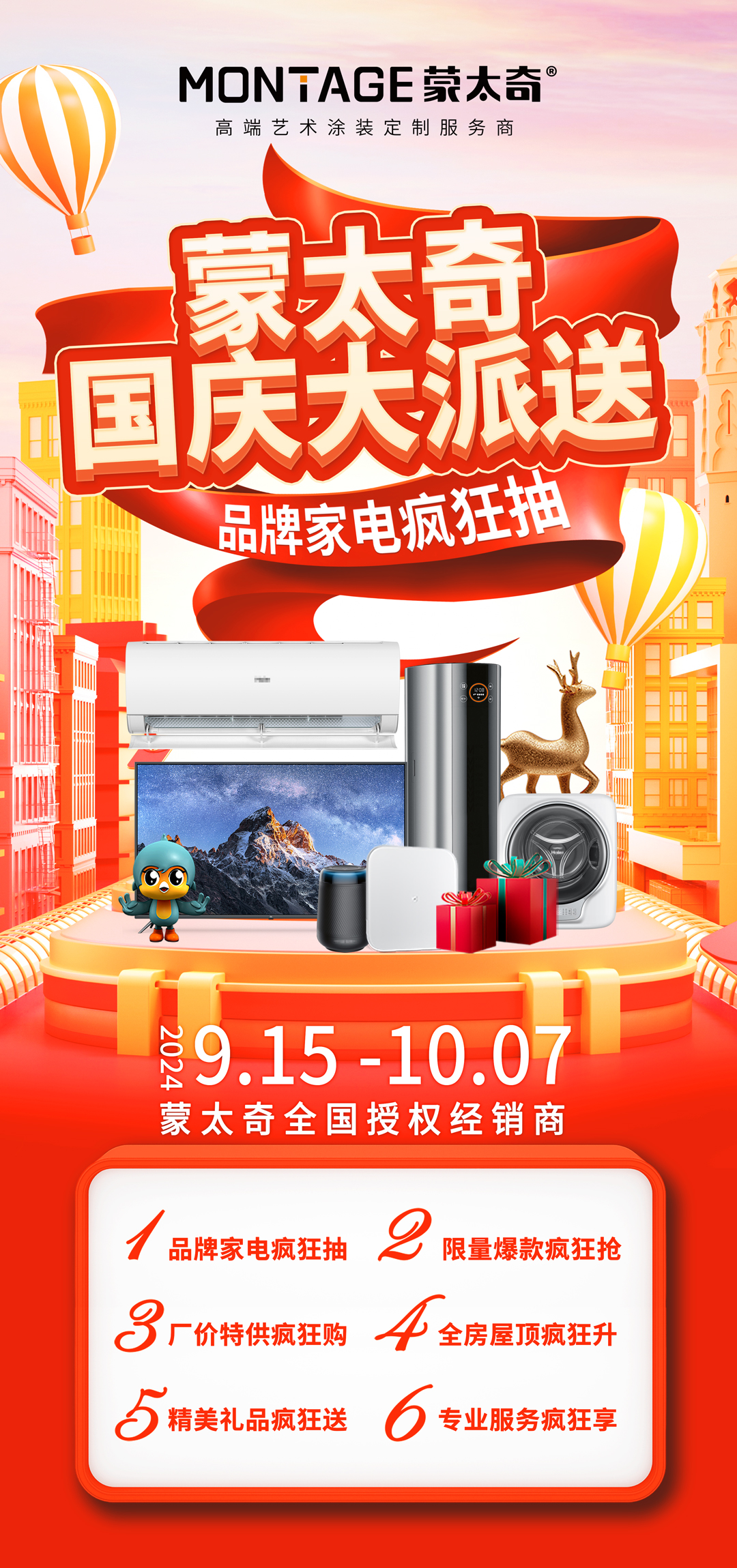 金九銀十,正值煥新家裝的黃金時期,9月15日-10月7日,蒙太奇推出國慶大派送·品牌家電瘋狂抽全國促銷活動,迎中秋、慶國慶鉅惠大放價,無論是新房裝修還是舊屋翻新,輕松實現一站式煥新家!