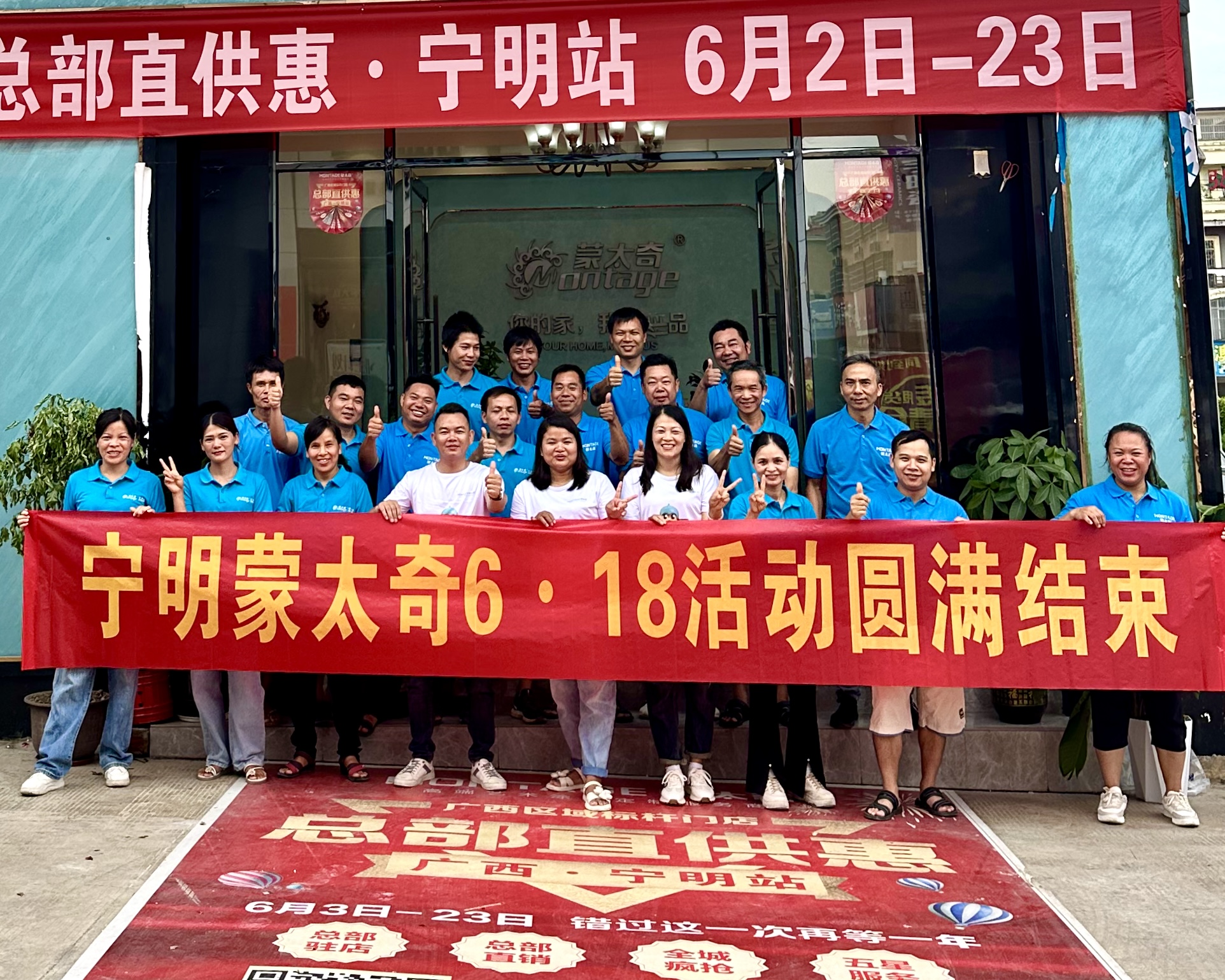 6月3-6月23日,蒙太奇推出年中重磅活動“狂歡618·送福到家”活動。此次活動,總部給予多項賦能政策,為了確保這次618活動能取得成功,蒙太奇在活動啟動前就進行了全面的規劃和部署。其中廣西寧明店作為廣西區域標的桿門店,蒙太奇總部和廣西寧明店聯動展開活動,以“總部直銷惠”為活動主線,進行終端單店活動。